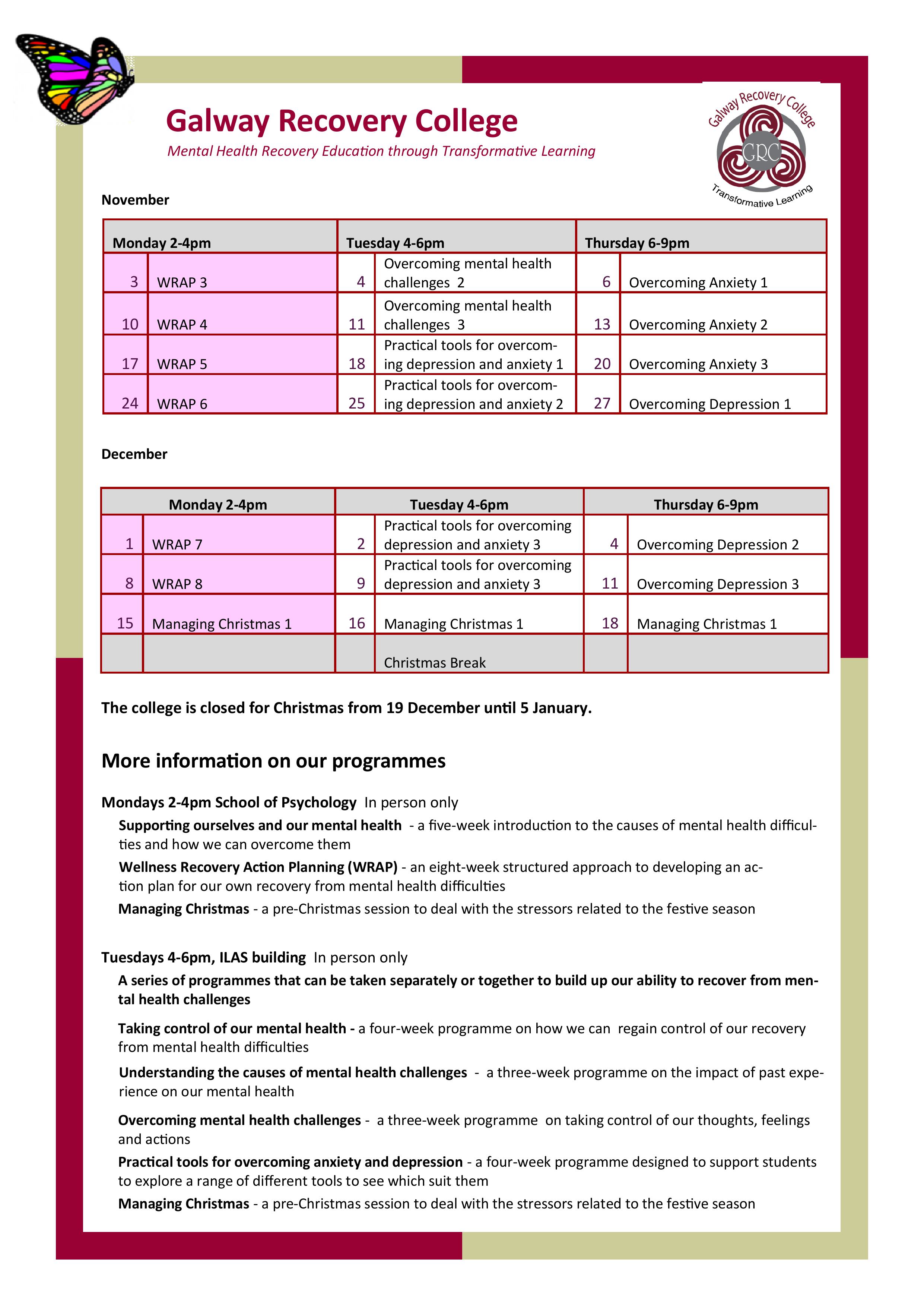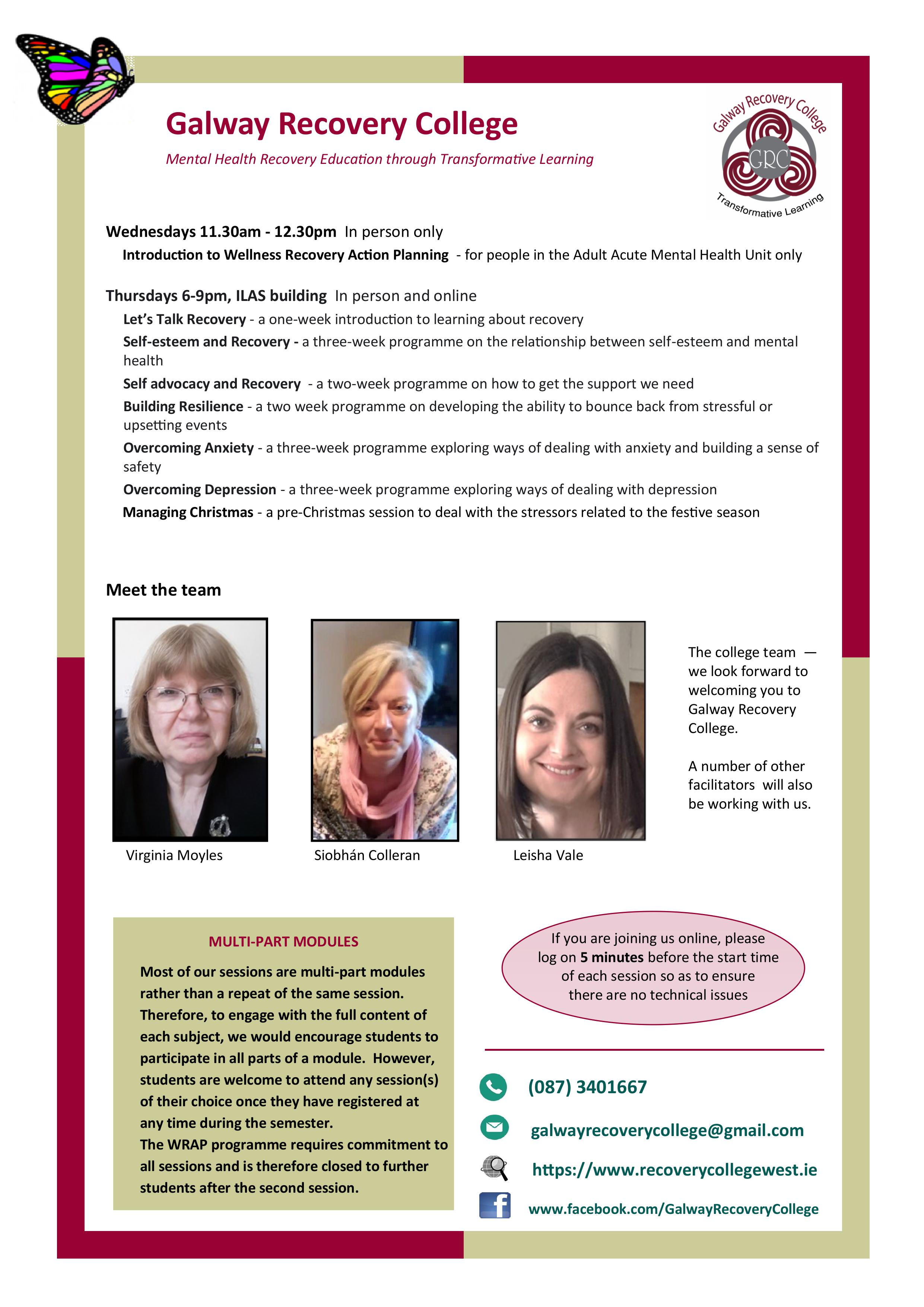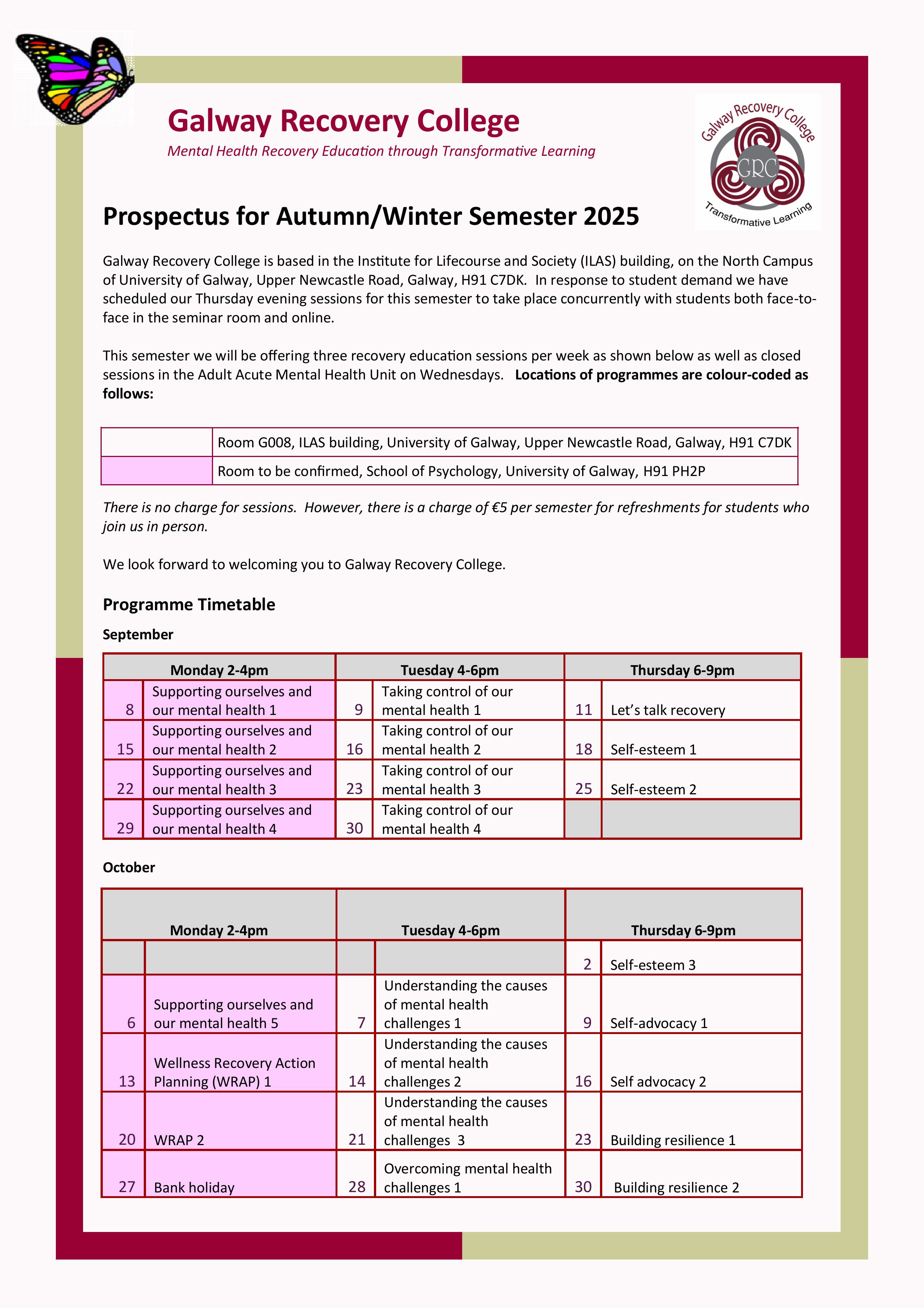 The Purpose of the Galway Recovery College is to create a culture of recovery, to improve quality of life and promote social inclusion by empowering people with mental health challenges, their families, friends and the community through co-produced education and learning together.
