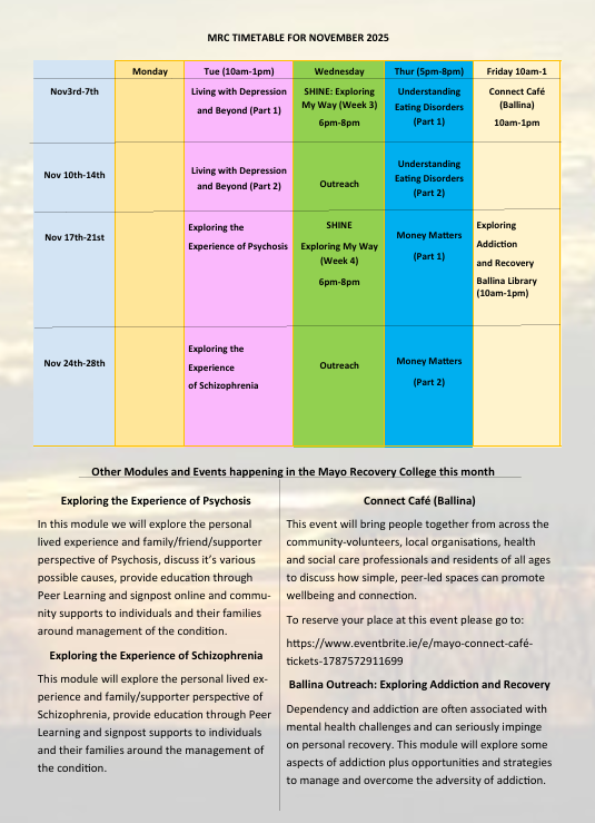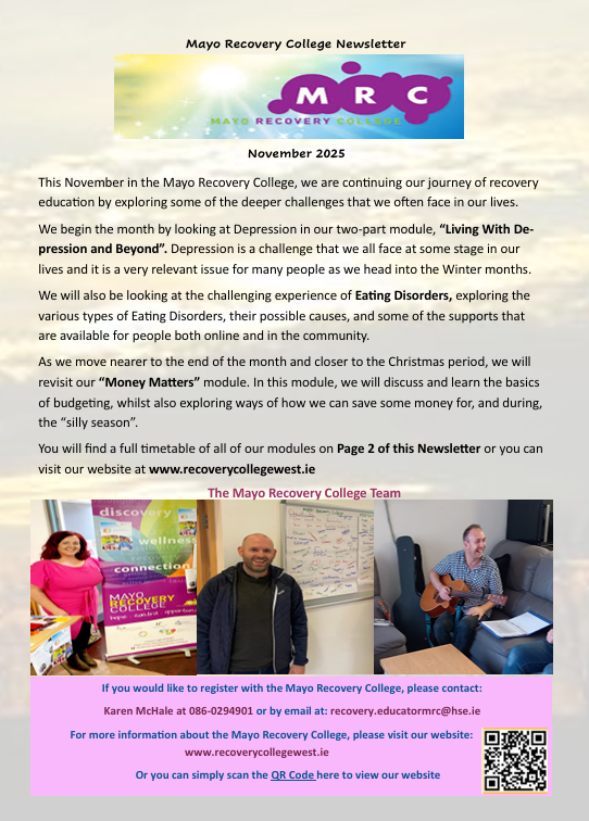 The Purpose of the Mayo Recovery College is to create a culture of recovery, to improve quality of life and promote social inclusion by empowering people with mental health challenges, their families, friends and the community through co-produced education and learning together.