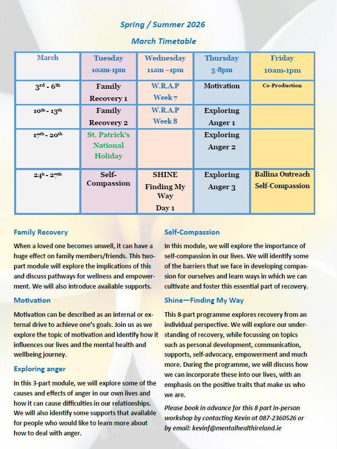 Mayo Recovery College returns with our time table for the Spring/Summer of 2021