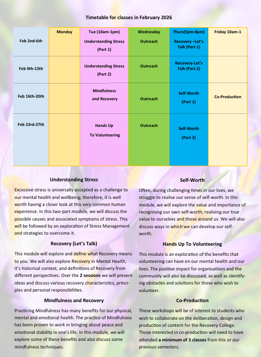 The Purpose of the Mayo Recovery College is to create a culture of recovery, to improve quality of life and promote social inclusion by empowering people with mental health challenges, their families, friends and the community through co-produced education and learning together.