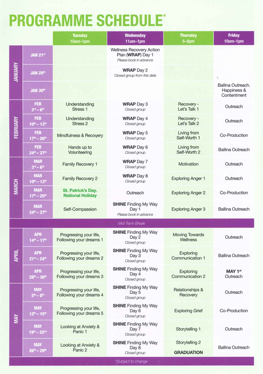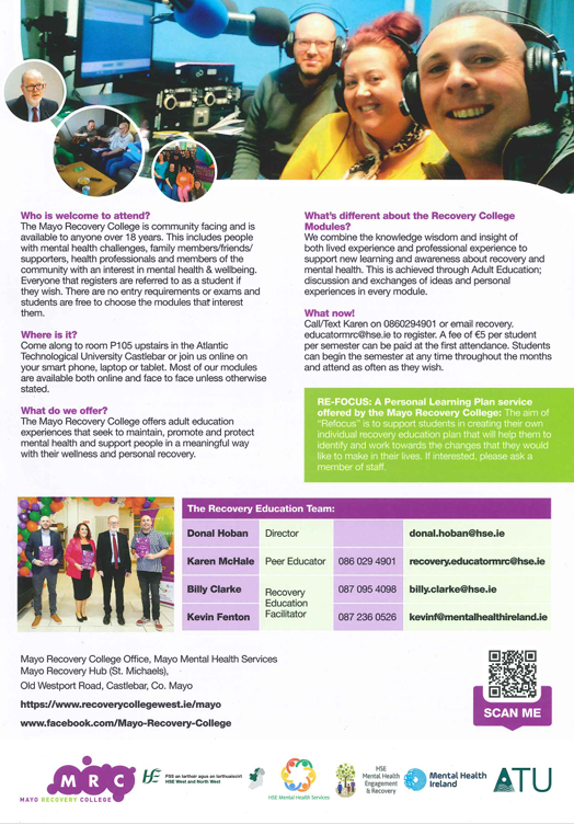 The Purpose of the Mayo Recovery College is to create a culture of recovery, to improve quality of life and promote social inclusion by empowering people with mental health challenges, their families, friends and the community through co-produced education and learning together.